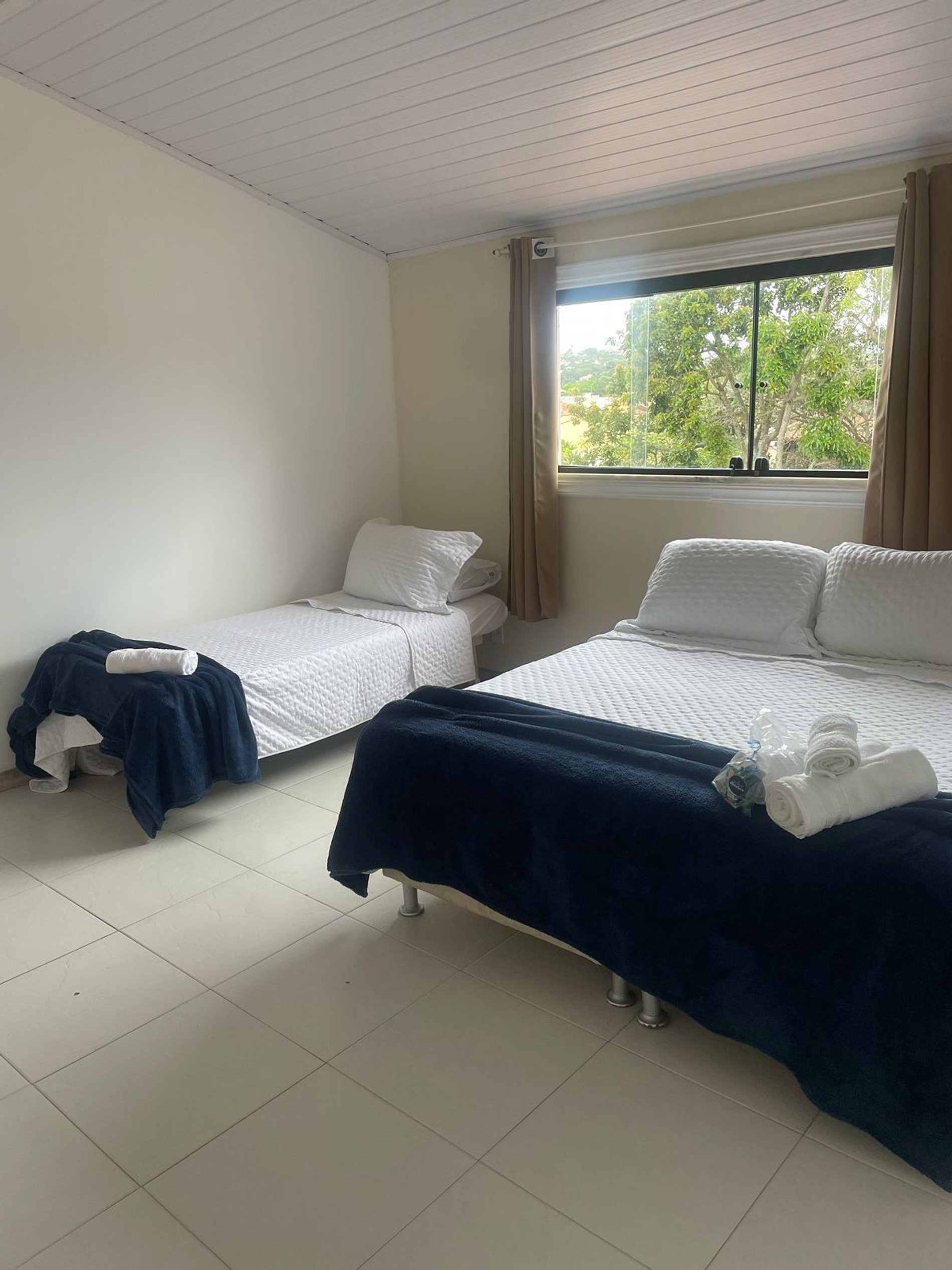 - Large superior room with a double and single bed, fan.