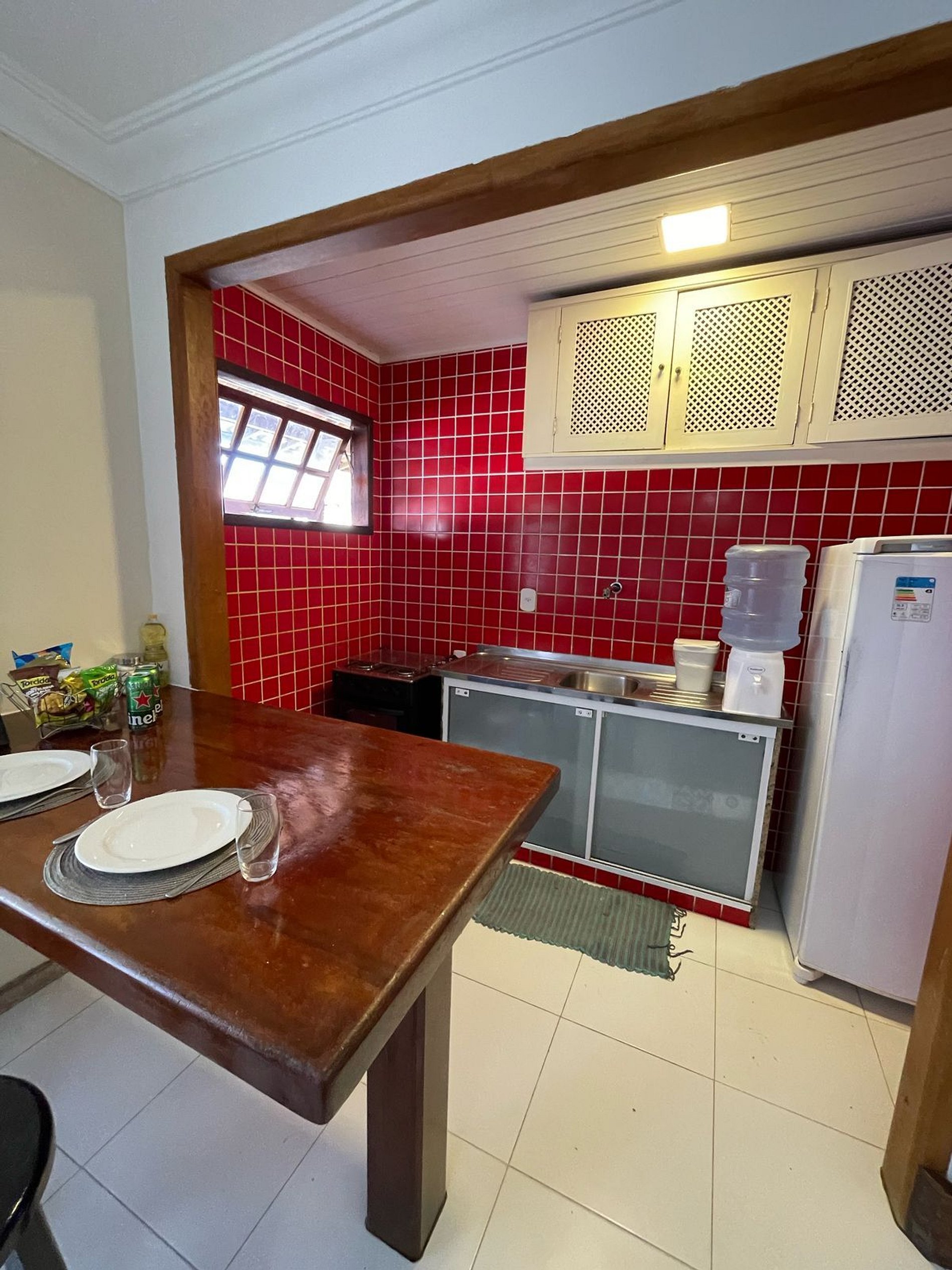 With cabinet, stove, refrigerator and all the utensils to prepare your meals.