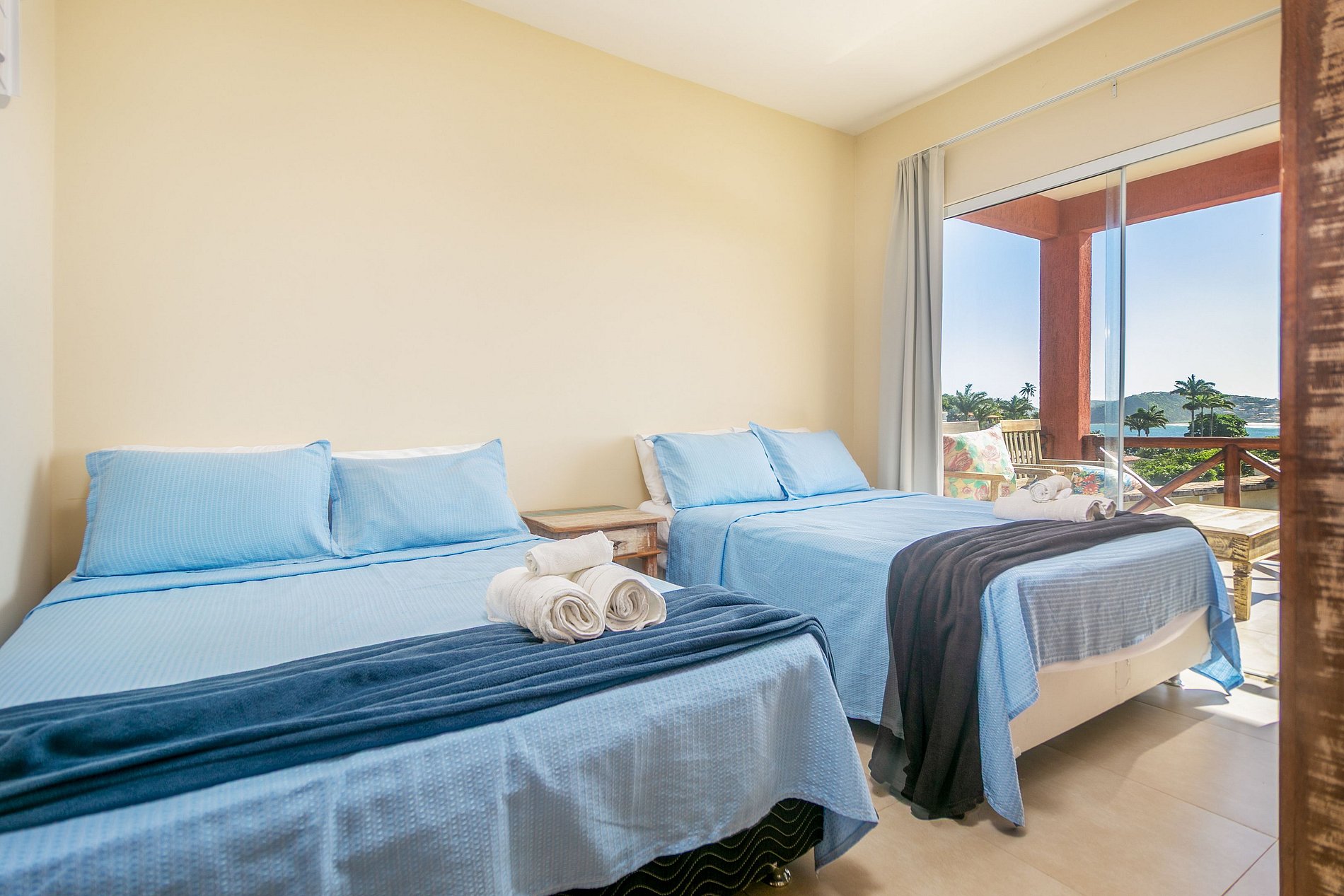 Com duas camas de casal, ventilador, ar-condicionado e vista para o mar, ideal para grupos maiores.