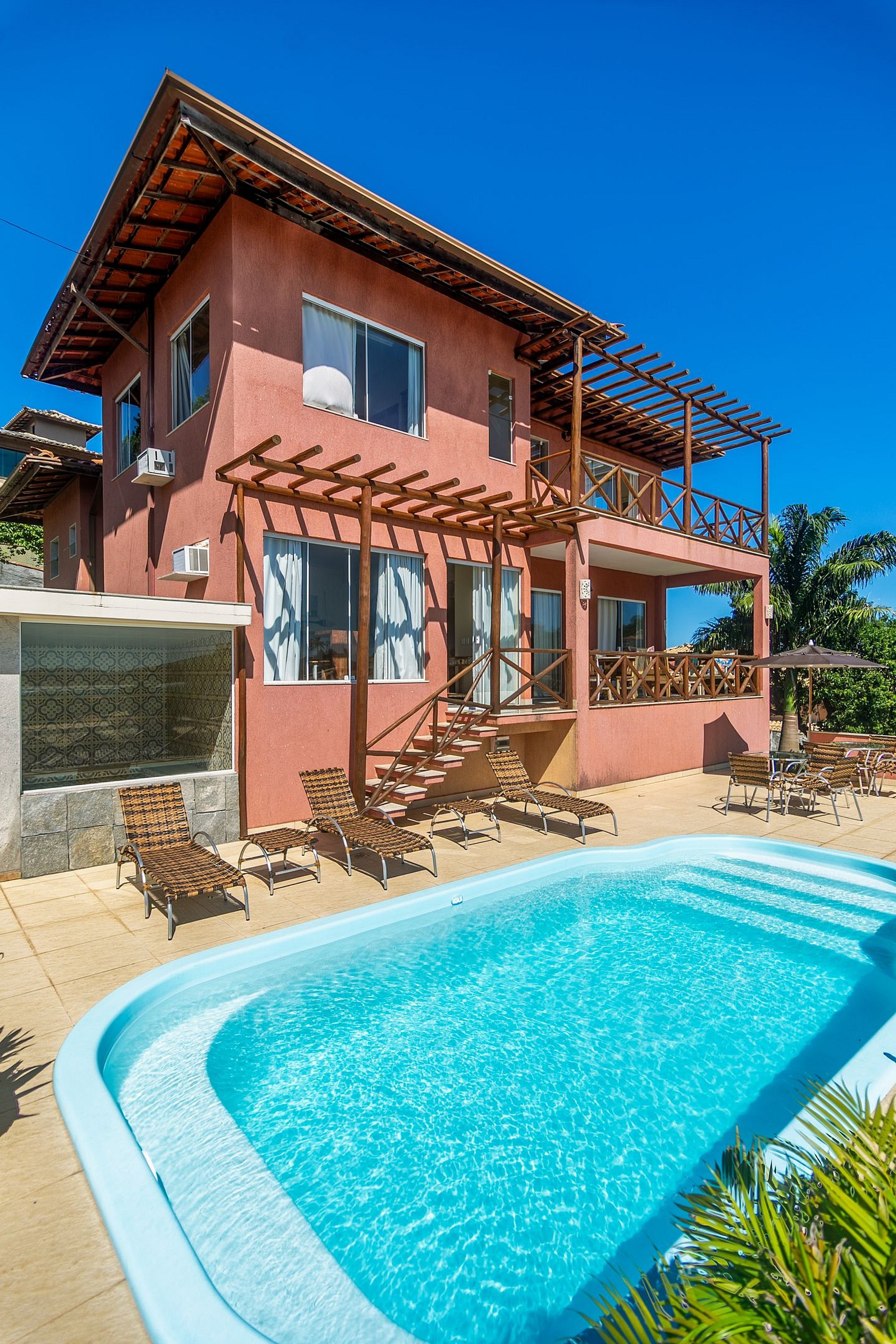 Dentro da casa, cada detalhe foi pensado para acolher você e sua família. São cinco quartos que convidam ao descanso — quatro deles com vista para o mar, onde o amanhecer ganha outro significado. A suíte oferece ainda mais privacidade e conforto. Todos os ambientes contam com ar-condicionado, ventilador de teto e roupa de cama e banho cuidadosamente preparadas para sua chegada. A sala de estar integrada à sala de jantar, com vista para o mar, cria aquele clima perfeito para conversas longas, risadas espontâneas e momentos que ficam na memória. A cozinha completa permite que cada refeição tenha sabor de carinho e praticidade. E para manter tudo conectado, o Wi-Fi cobre toda a residência.E é ao sair para a área externa que a magia acontece.• Área gourmet com churrasqueira, perfeita para refeições descontraídas; • Piscina com espreguiçadeiras, ideal para relaxar sob o sol de Búzios; • Sauna, para momentos de descanso e bem-estar. Um espaço pensado para quem busca conforto, privacidade e a verdadeira essência de Búzios — com vista privilegiada para as praias de Ferradurinha e Geribá.