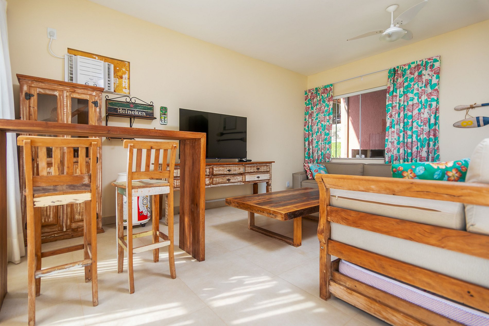 A sala de estar climatizada, com Smart TV, convida ao descanso depois de um dia de mar.