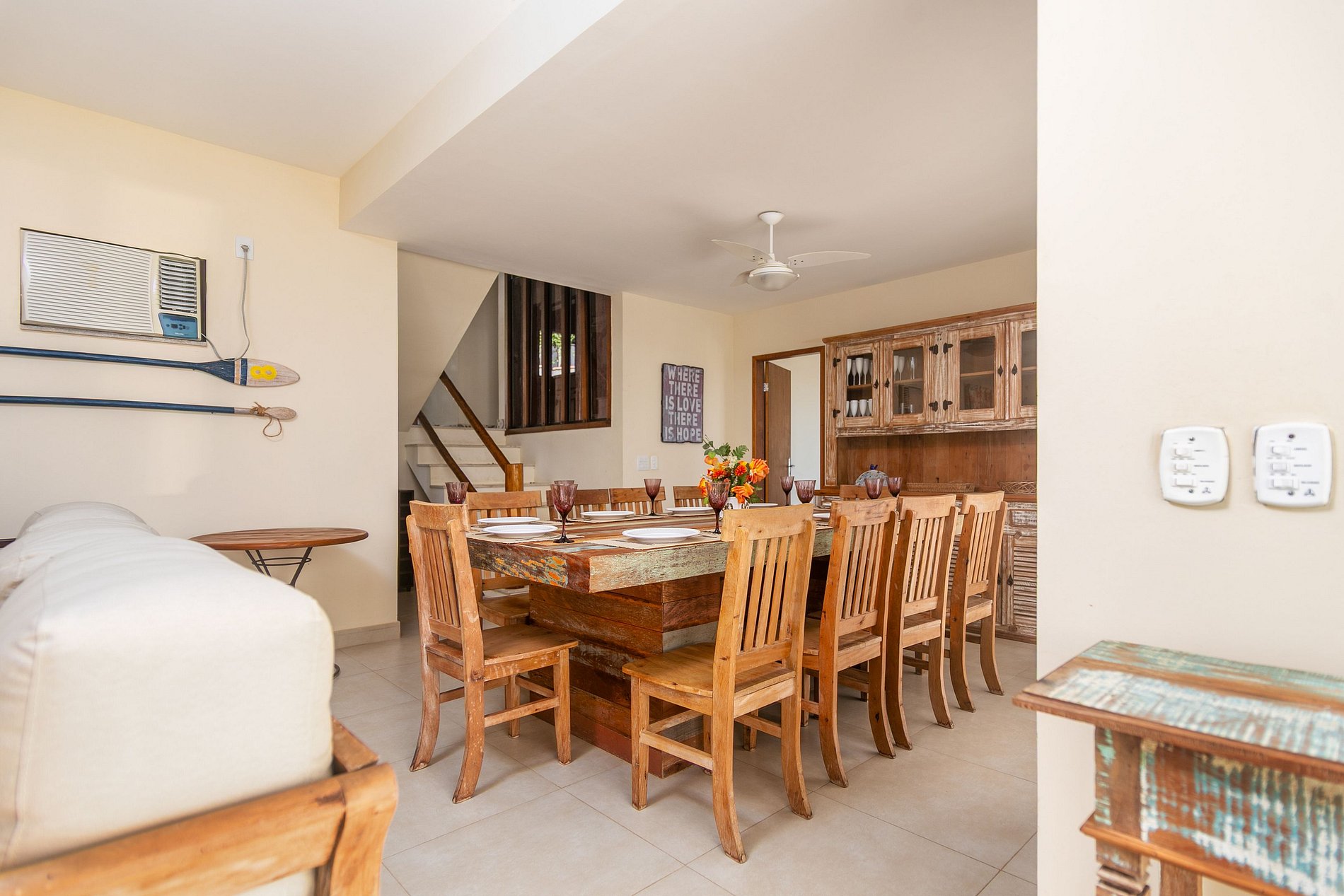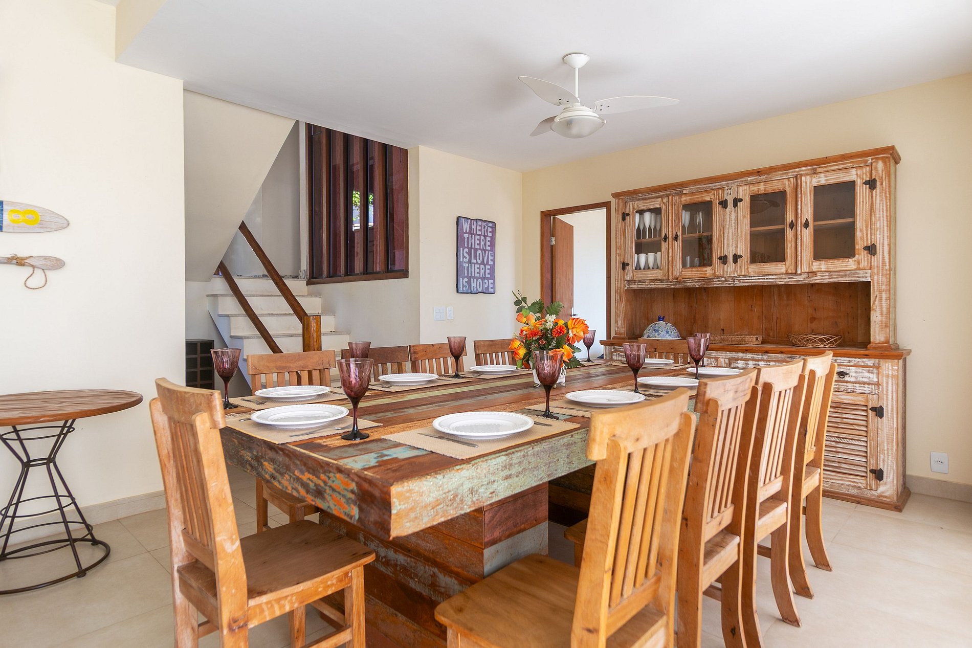 A sala de jantar, com sua mesa de 12 lugares e uma vista de tirar o fôlego, transforma cada refeição em um momento especial.