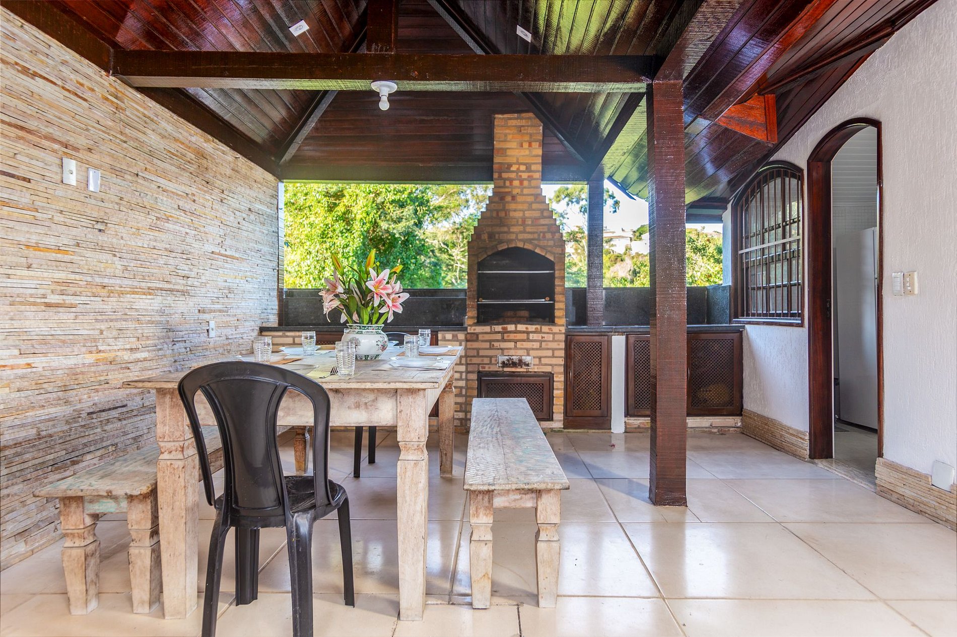 Além da área gourmet com churrasqueira privativa, a casa tem 03 quartos climatizadas, cozinha completa, sala ampla e confortável;